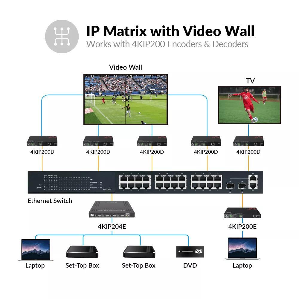 No matter it’s a sports bar, retail store, house of worship, casino or other scenario, the 4KIP204E 4K HDMI over IP encoder can work with PII4KIP200 decoders to build a distributed IP matrix with video walls.