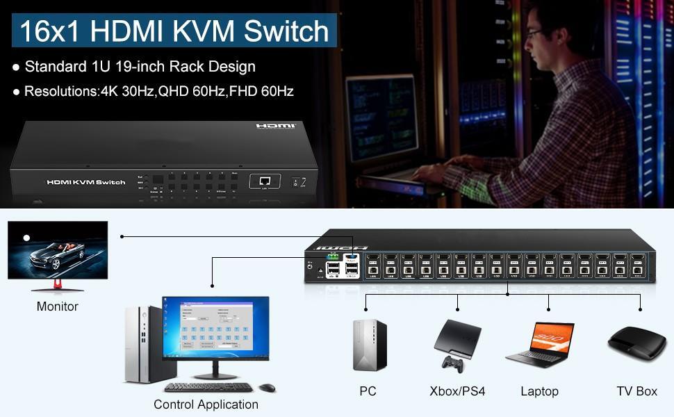 1* 4X3 HDM KVM Switch, 4* 5ft KVM cables (HDMI+USB), 8* HDMI cables 1* IR remote control, 1* IR extension cable, 2* Rack-ears, 1* DC 12V power adapter, 1* User manual. (Each PC must make 3 video connections to KVM for triple monitors.)